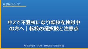 中学2年生で不登校になり、お子様の将来を案じて転校という選択肢を考えていらっしゃる親御さん、そして今、学校に行きたくても行けないと悩んでいるご本人へ。中学2年生という多感な時期に不登校を経験し、このタイミングで「転校」と […]